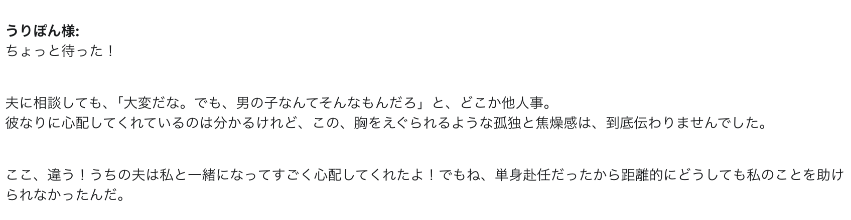 彼なりに心配してくれているのは分かるけれど、この、胸をえぐられるような孤独と焦燥感は、到底伝わりませんでした。
