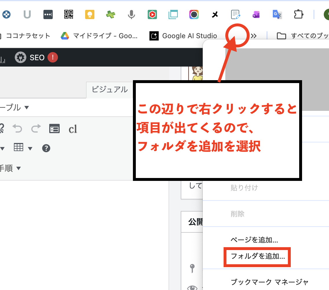 Chromeの画面のブックマークバーのところで右クリックしてフォルダを追加を選択!!