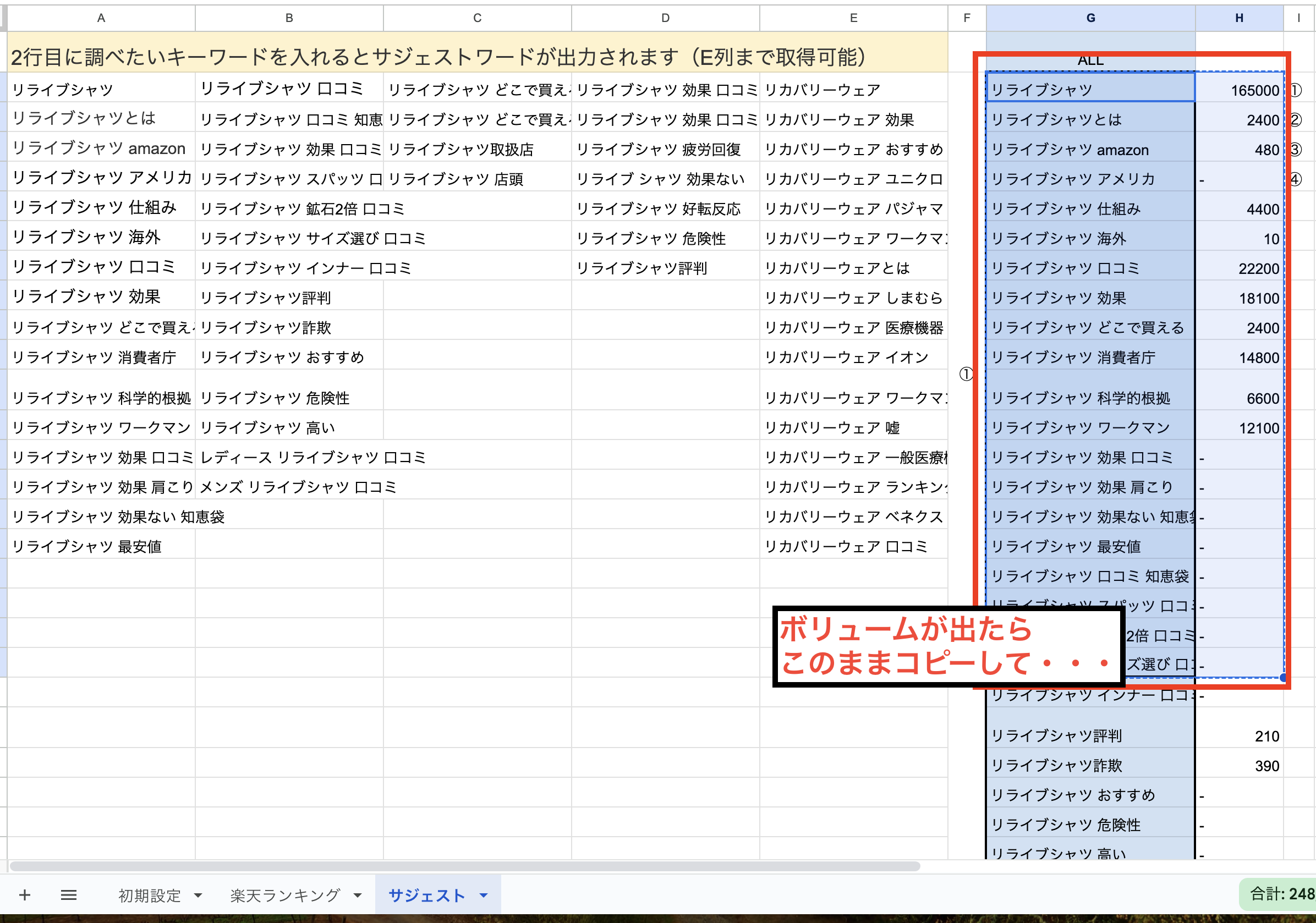 この、一覧になったサジェストキーワードと検索ボリュームをコピーして(コピー笑)