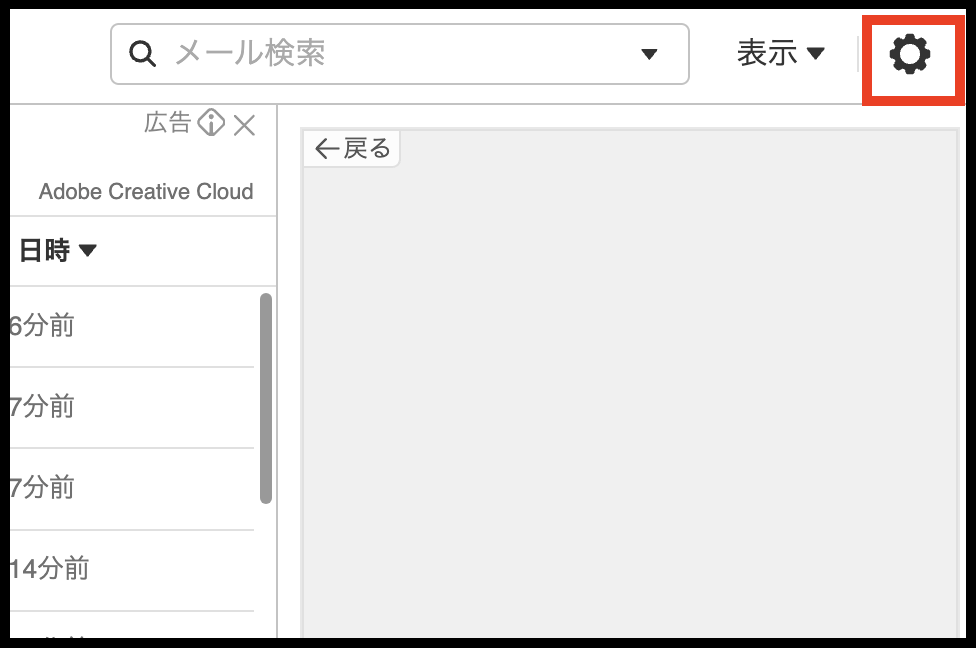 Yahoo!メールの受信ボックスを開き、右上にある歯車のようなマークをクリックしてください。